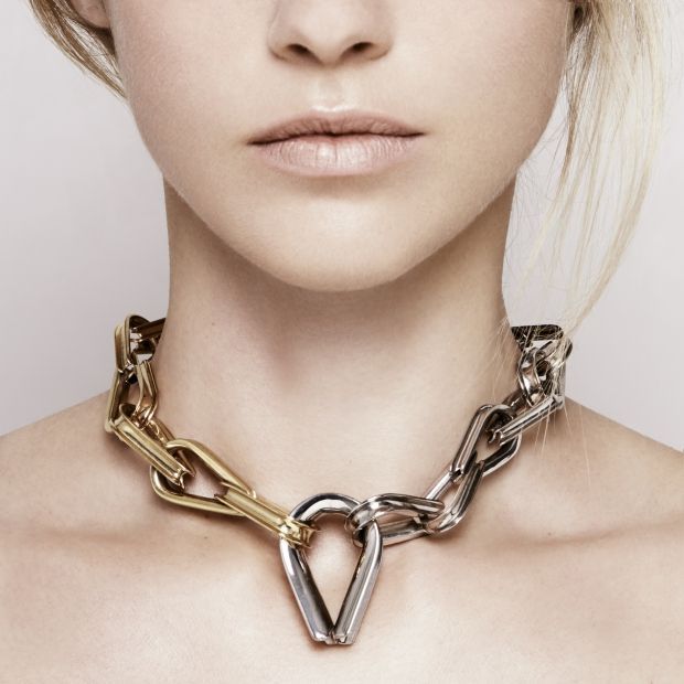 Chaîne bicolore de la collection Ellipse, à la fois statement et graphique. Elle se porte aussi bien le jour, sur un t-shirt, que le soir, sur une robe bustier.